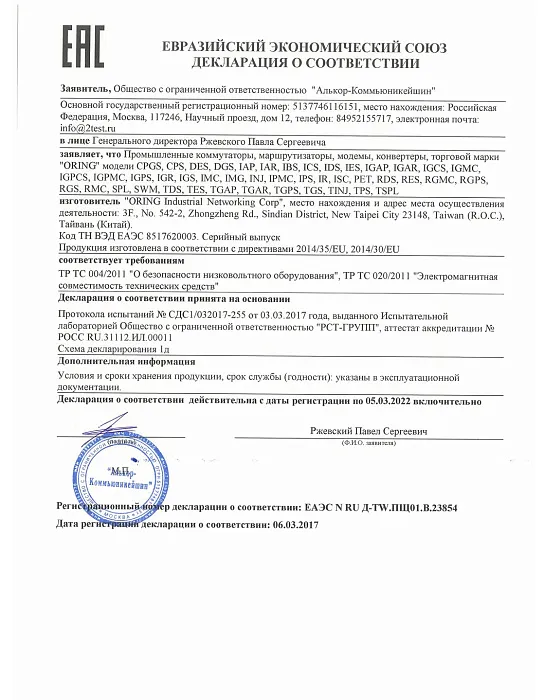 Декларация Таможенного Союза на оборудование ORing