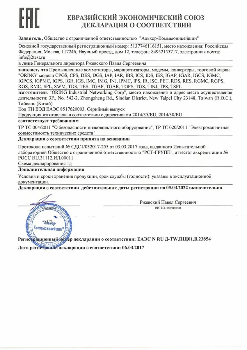 Декларация подтверждает соответствие промышленного коммутационного оборудования ORing требованиям Таможенного союза ТР ТС 004/2011 «О безопасности низковольтного оборудования», а также ТР ТС 020/2011 «Электромагнитная совместимость технических средств».