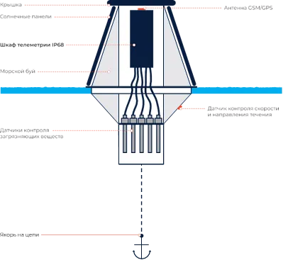 Система выполняется на базе буя, состоит из комплекта из- мерительного оборудования (подбирается индивидуально), системы пневмоочистки, метеорологического оборудования (для определения скорости и направления распространения загрязняющих веществ), а также шкафа телеметрии, защищенного по стандарту IP68, с дополнительной системой электропитания от солнечных батарей.