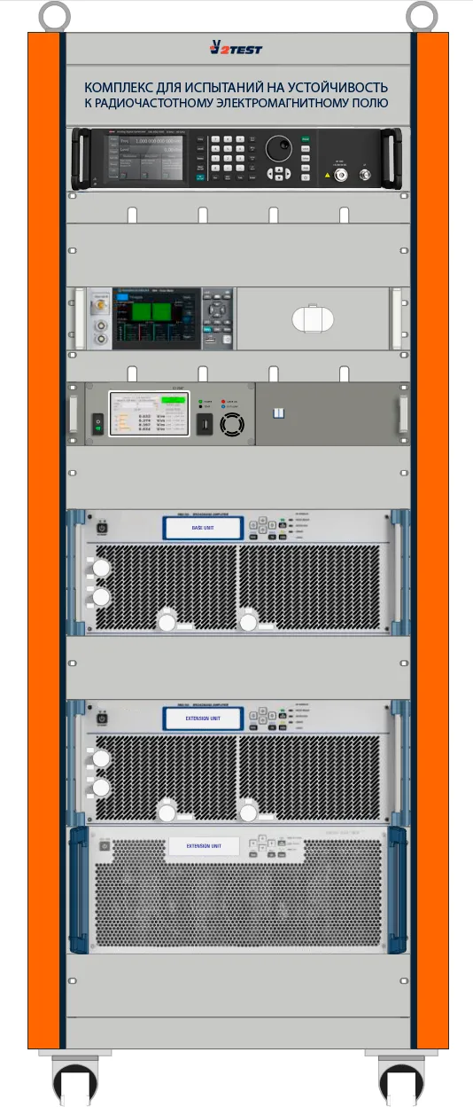 Комплекс для испытаний на устойчивость к радиочастотному электромагнитному полю 2TEST – предназначен для оценки устойчивости оборудования к радиочастотным электромагнитным полям, то есть воздействие по методам ГОСТ 30804.4.3, КТ 160G/14G, ГОСТ РВ 6601-001 и др.