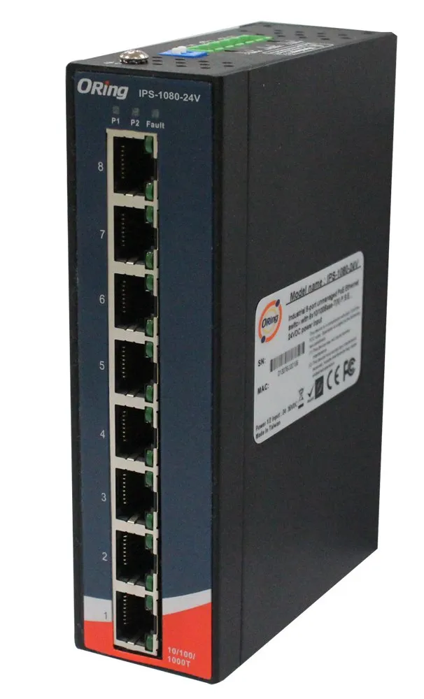IPS-1080A - тип неуправляемых Ethernet-PoE коммутаторов с функцией P.S.E. Серия IPS поддерживает технологию PoE (Power over Ethernet), системы передачи электроэнергии, а также данные удаленного устройства через стандартную витую пару в сети Ethernet. IPS-1080A коммутатор имеет в наличии 8x10/100Base-T(X) P.S.E. (Power Sourcing Equipment) портов. P.S.E. - это устройство, обеспечивающее наличие энергии в PoE установке. Прибор обладает значительным спектром рабочих температур от-40 C до 70 C, удовлетворяет большинству операционных сред. Таким образом, коммутатор является одним из самых надежных вариантов Ethernet PoE приложений.